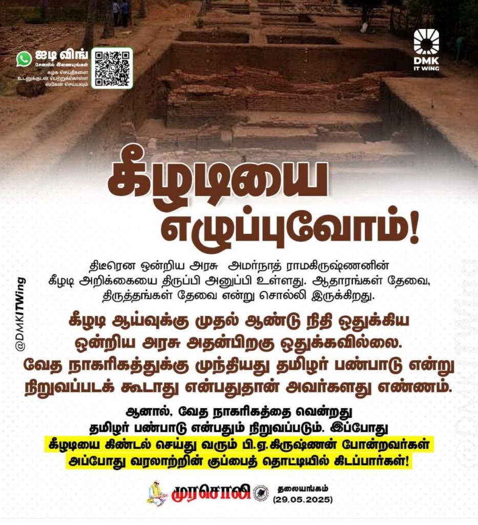The meme-poster above is part of a broader campaign by the DMK and Tamil cultural organizations to pressure the Indian central government into recognizing Keezhadi’s historical importance, granting it protected status, and supporting further research and public dissemination of its findings.