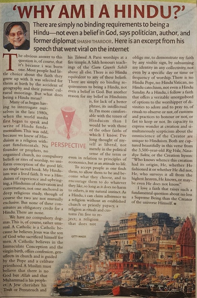 For instance, one must be educated enough to distinguish between Hindu good news and Christian good news. Freedom to proselytize also comes with a moral responsibility. One cannot have unlimited freedom. That would be a level playing field. No other form of conversion can ever be justified, for it is a gruesome violation of human rights, to exploit the vulnerable status of an individual be it due to innocence/poverty/personal problems and so on. It is the pinnacle of religious intolerance that is against achieving world peace. The issue of religious proselytization highlights the fact that Abrahamic faiths are unable to accept the differences of other paths to God and live-in harmony. This goes against the norms of peaceful co-existence. It is ironical that Tharoor lectures a faith with no history of religious conversion on ‘tolerance‘ and acceptance of other religions.