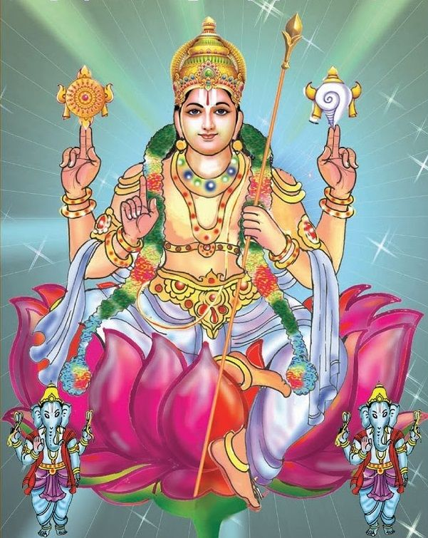 Portrayed as a deity carrying Vishnu’s iconic weapons and symbols.