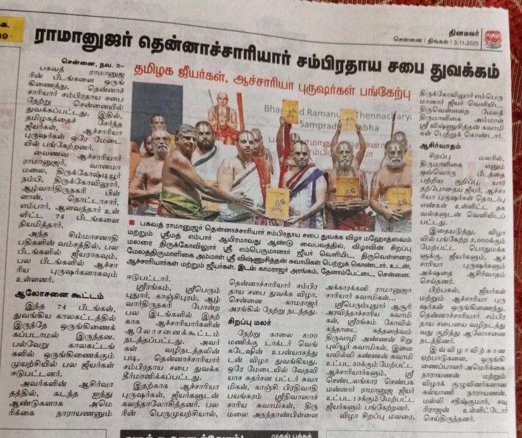 If this initiative — announced with such public fanfare — had been not named itself with the exclusionary term “tennaachaarya” , it would have been warmly welcomed by all Sri Vaishnavas. Since this new organisation however is calling itself “tennaachaarya sampradayaSabha” purportedly dedicated to propagating the historic 74 simhaasanaadipathi spiritual heirs , it reduces itself unfortunately to just yet another narrow , parochial sectarian outfit engaged in meaningless inter-sectarian polemics .