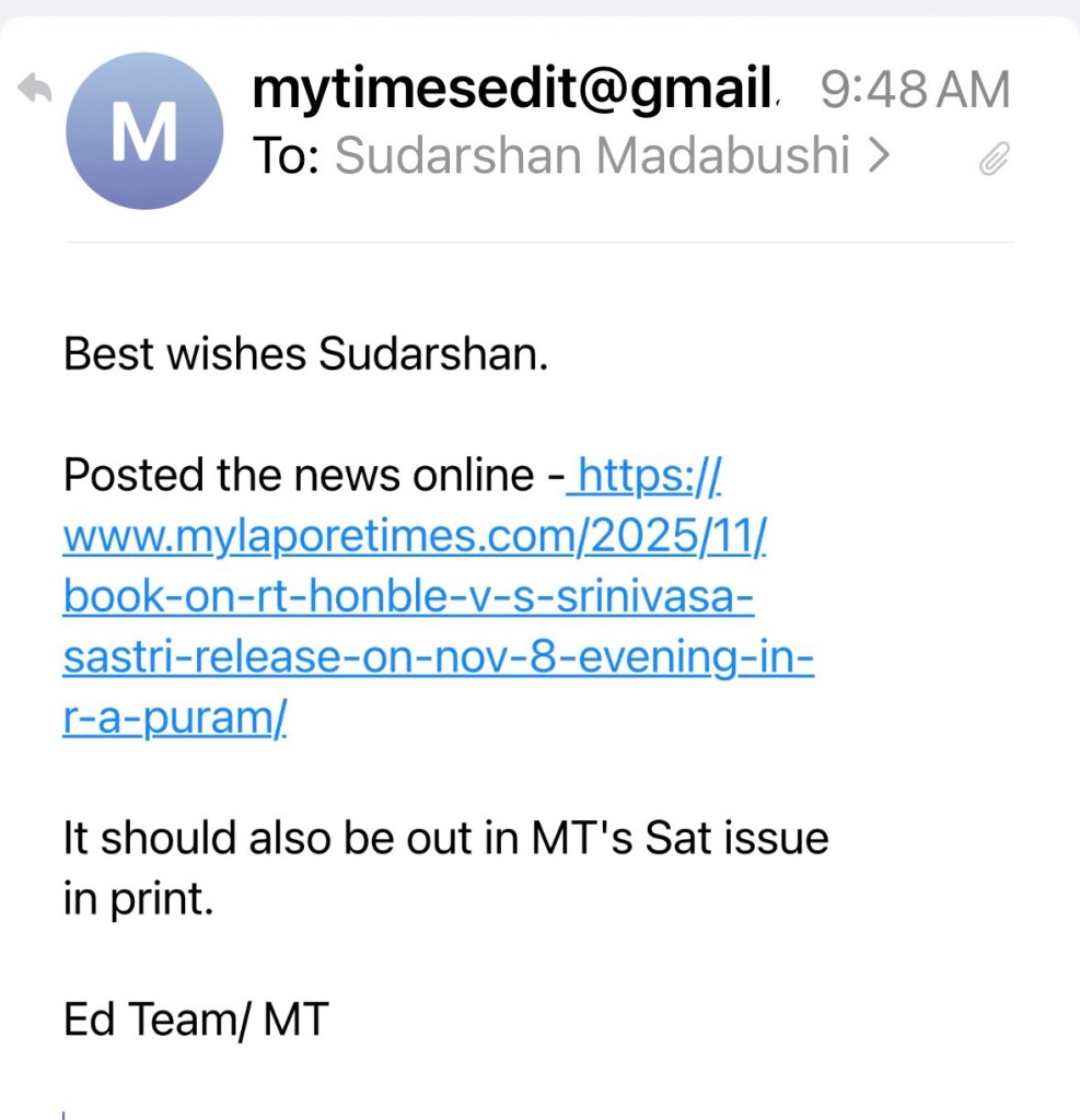 I was one of the attendees at the Chennai International Center on your book launch on Shri. Srinvasa Sastry, about whom I had known very little before attending this event. My late father had told me about his great oratorical skills in English that impressed even the British. I came away with a very good understanding of the person and his views, and his differences with the Big 4 of the Indian Freedom movement.