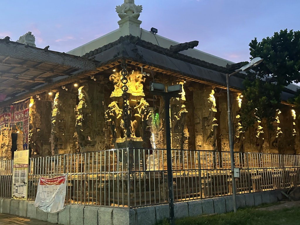 The processional Deities then ascended the flight of stone steps to climb into the great “aayiramkaal mantapam” with vaulting roof and granite stone pillars all bearing exquisite, intricately sculpted carvings, all in the ancient Pallava and Chola-times style of temple architecture.