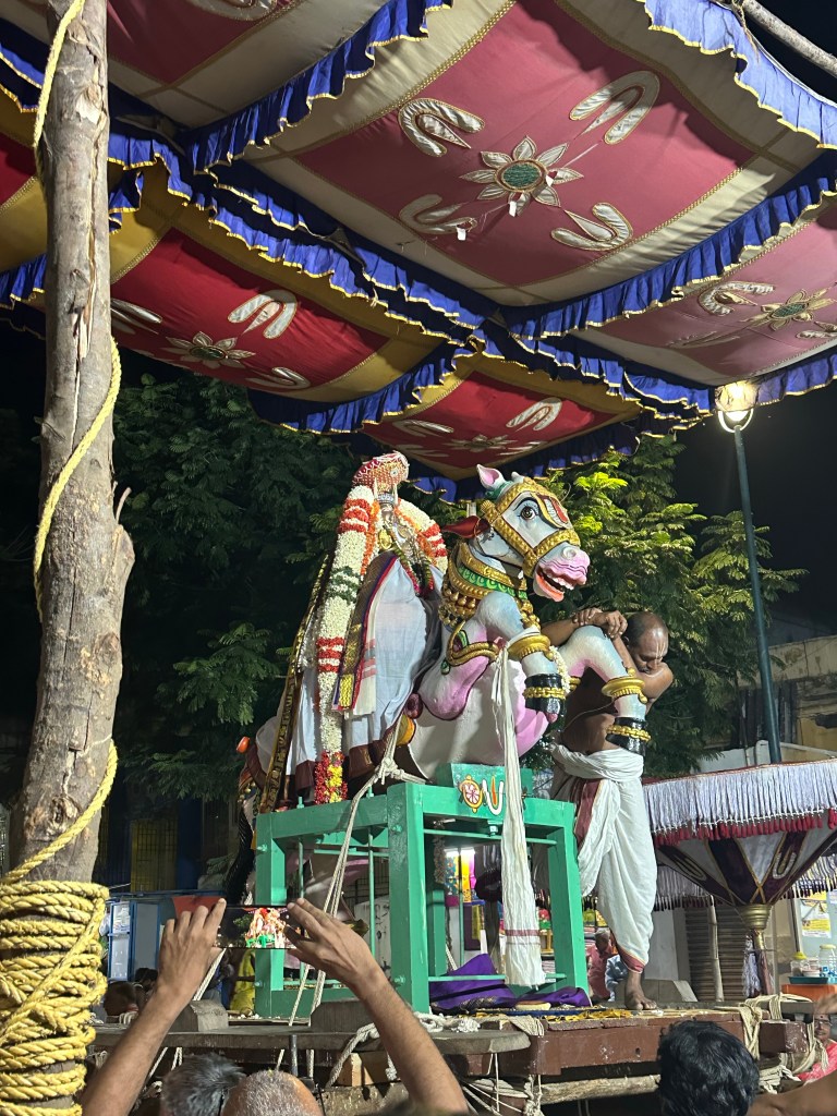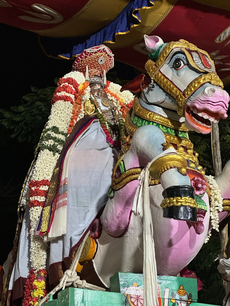 As the procession of Perumal and Thaayaar slowly, in all its glory and majesty, wended its way from the temple sanctum to the outer main mantapam , Swami Desikan’s own glorious procession on a horse-palanquin — “ashwa vaahanam” — that had begun, in fact, an hour and half earlier, previously from Thoopul, arrived at the great portal gates (mahaadwaara) under the towering mahagopuram of the Kanchipuram temple .